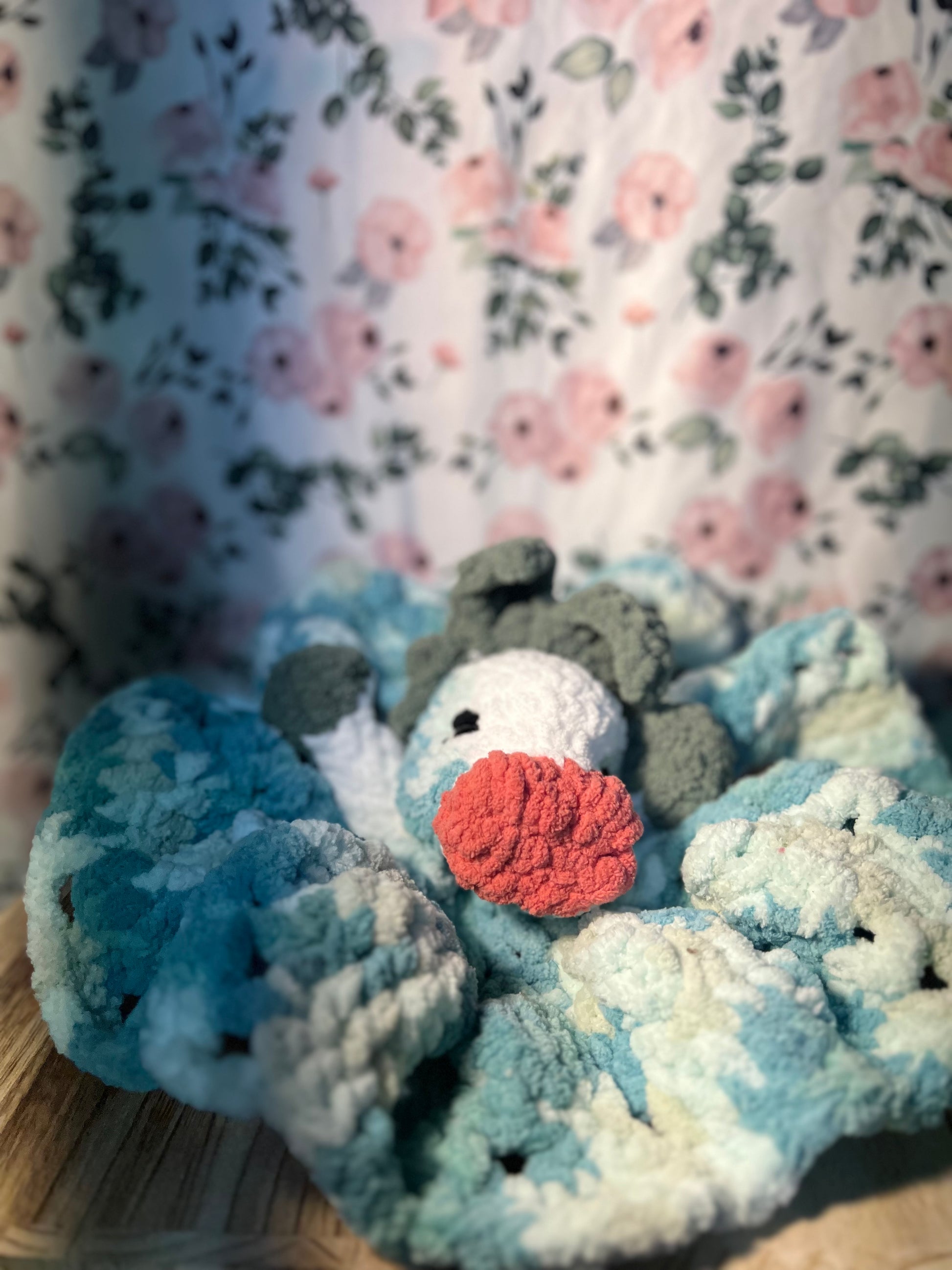 Crochet cow lovey, available as shown only at this time, polyester, approximate size- 14", 9.15 oz