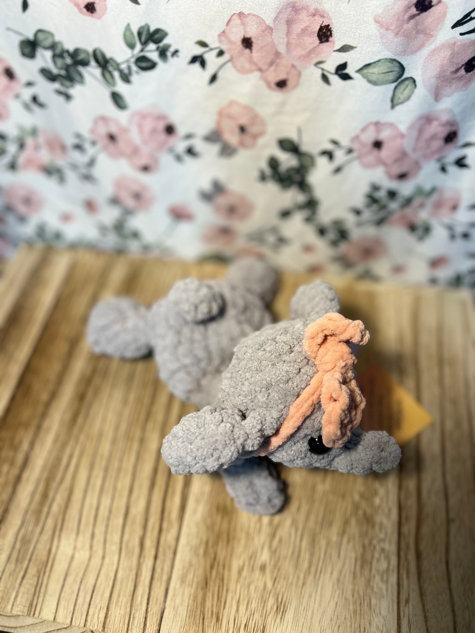 Crochet elephant snuggler, removable pink headband, light grey, polyester, approximate size- 8.5" long, 6.5" wide arm to arm, 3.53 oz