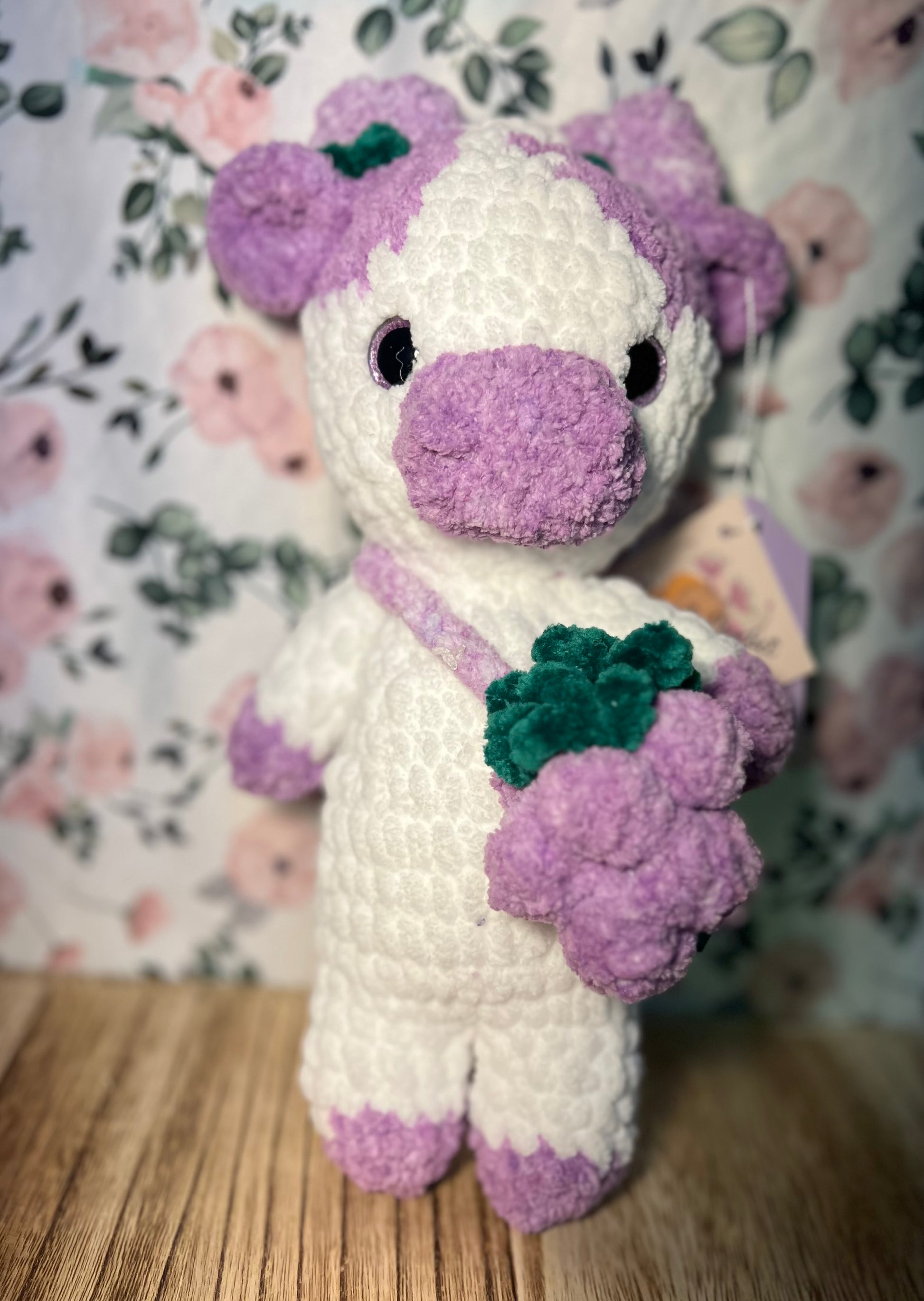 Crochet grape cow, available as shown, polyester, approximate size- 12" long, 6.5" arm to arm, 7 oz