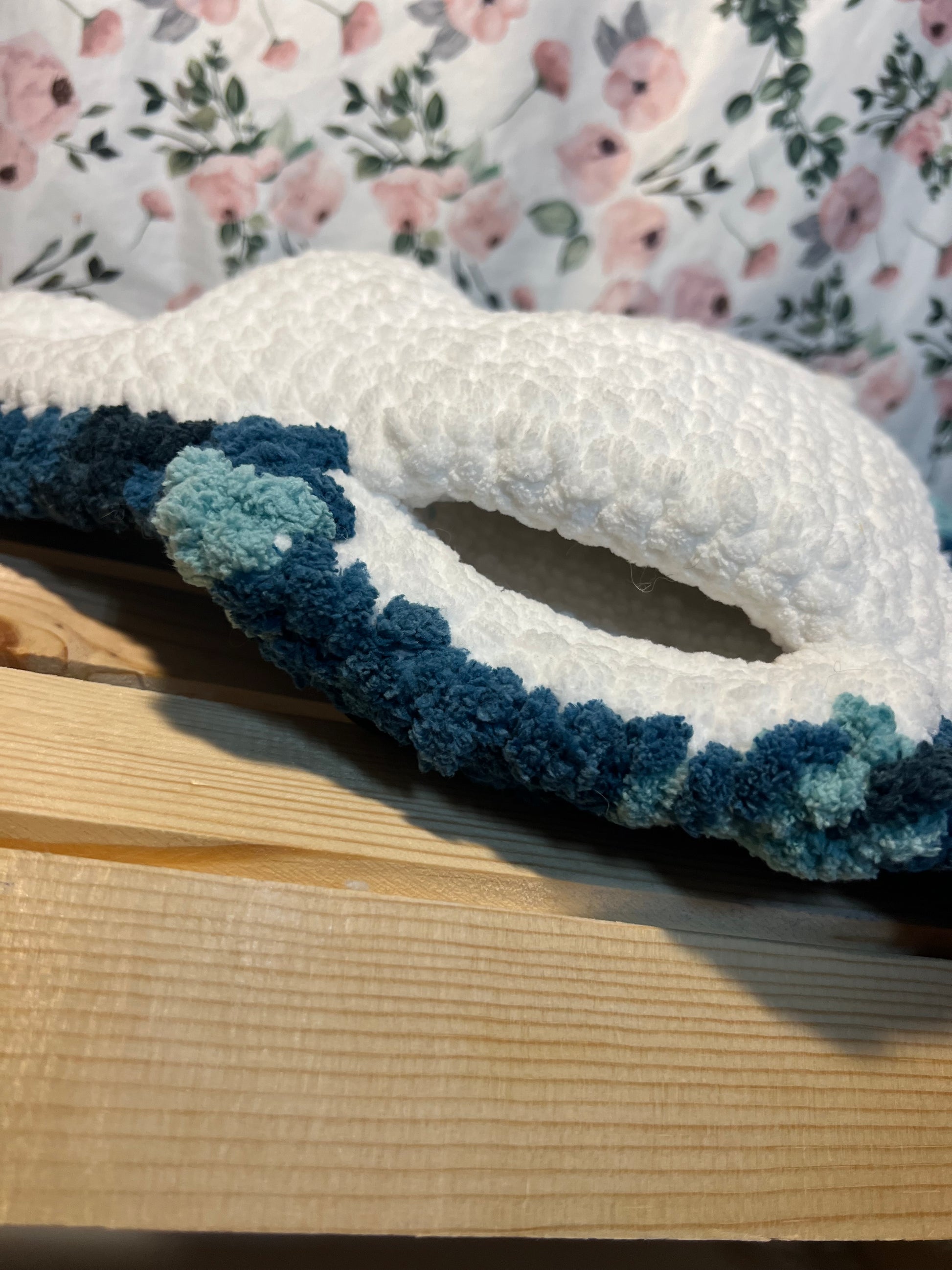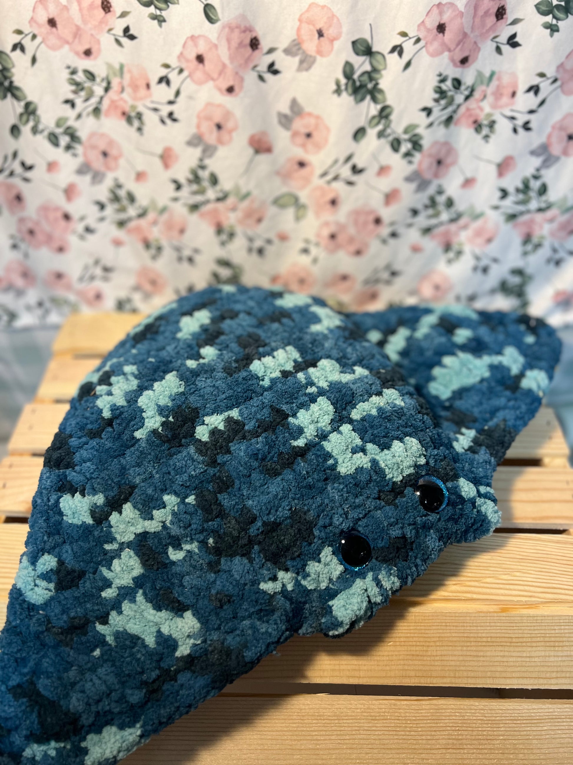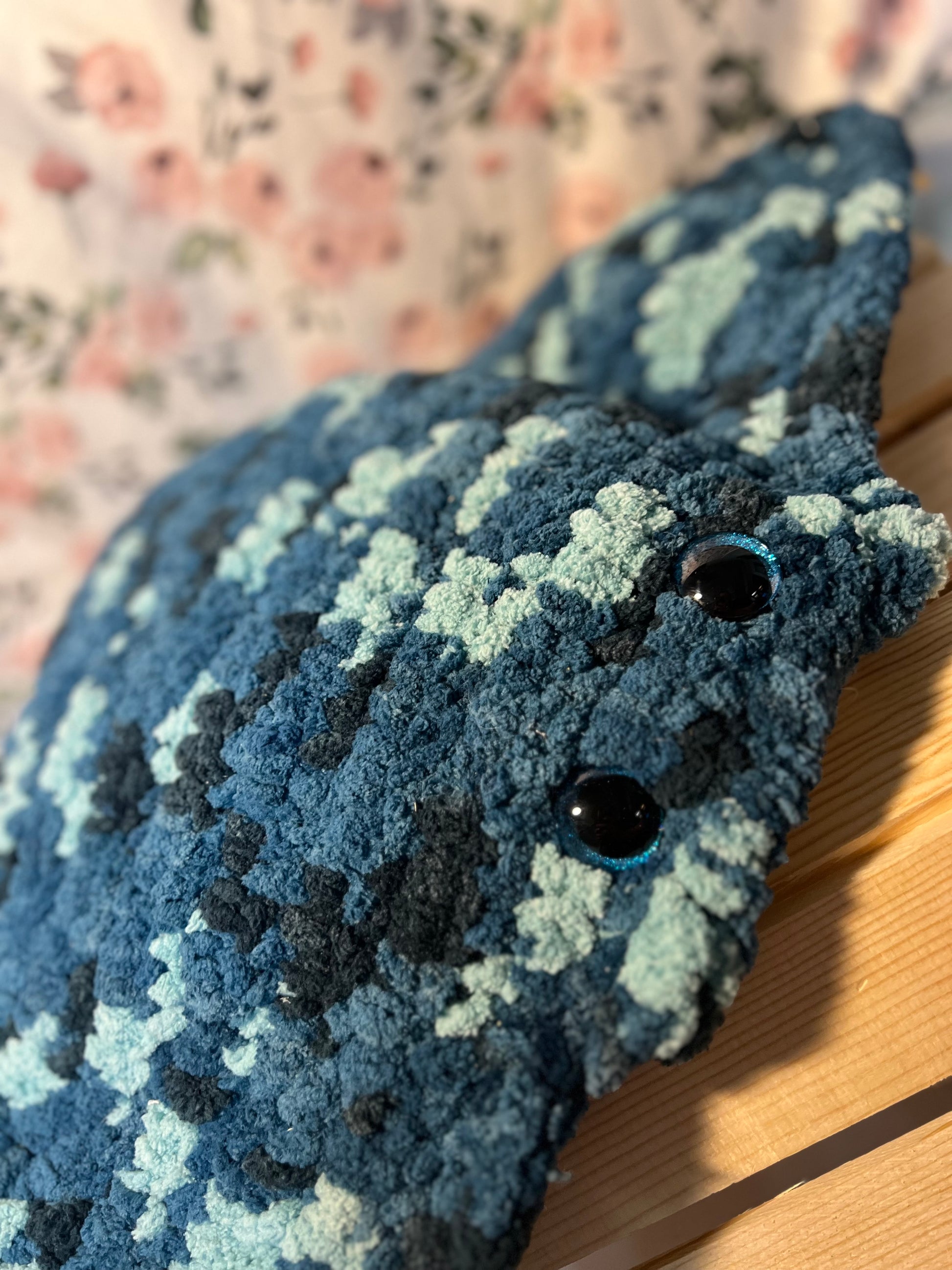 Large crochet stingray with pocket, available as shown or as a custom order upon request, polyester, approximate size- 22" wide, 15" long, pocket- 6"x10", 25 mm safety eyes, 1 lb 2 oz