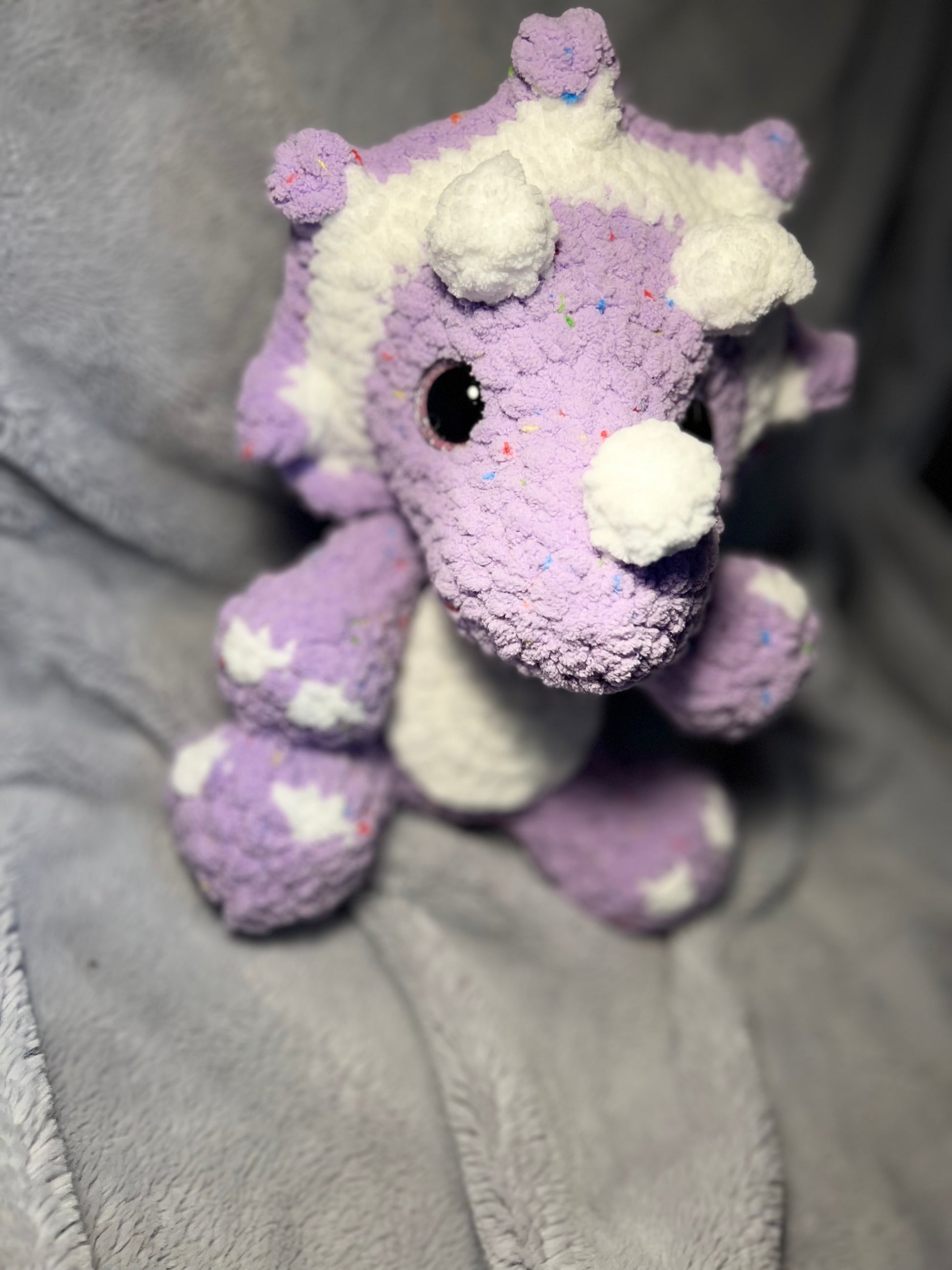 Crochet triceratops, available as shown or can be custom ordered. Polyester, approximate size- 9" (tail to leg) 11" length 8.5" (leg to leg) 11 oz